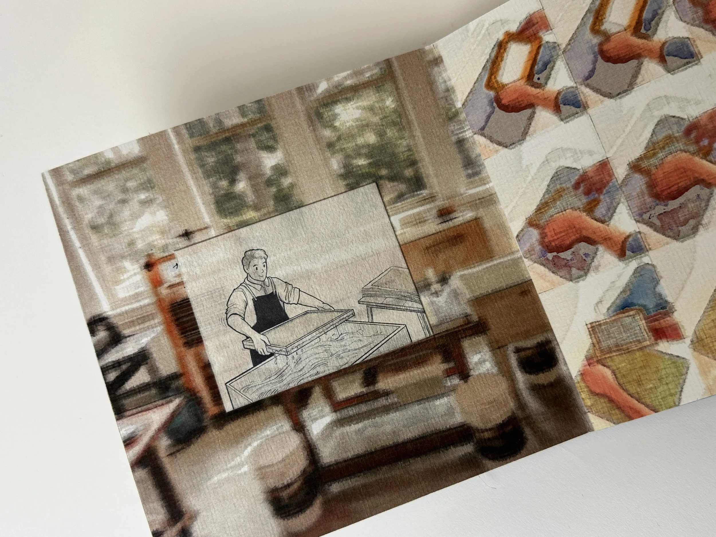 Brand book is a specially designed publication intended to be displayed within the commercial space. It serves as an engaging element that attracts customers and invites them to interact more deeply with the brand and the traditional craft of papermaking.