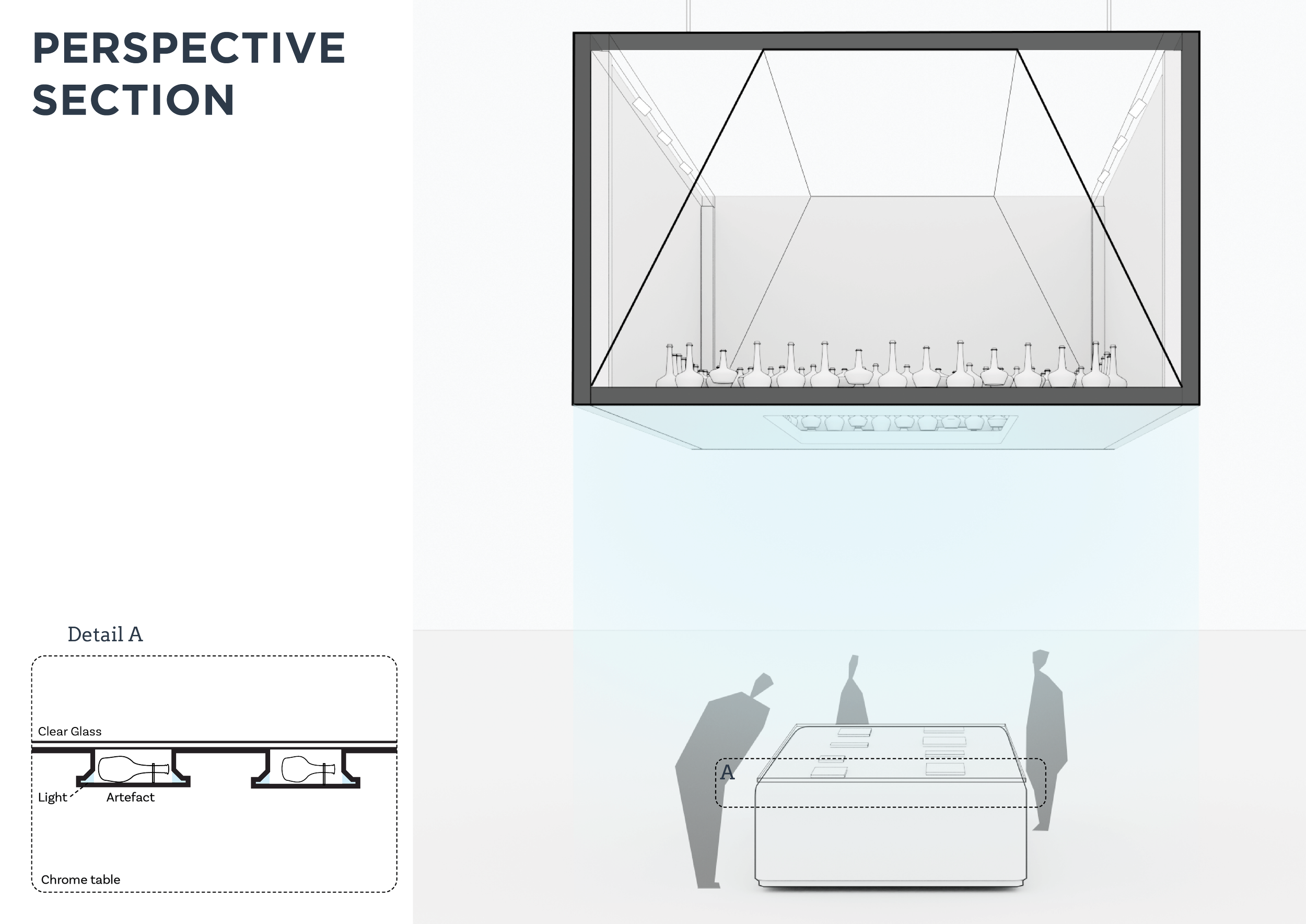 The design reflects on these silhouettes, using layers of glass and shifting light to evoke a quiet passage through time. In this installation, the artifacts are no longer seen as broken remains but as vessels that carried culture, movement, and lived experience, much like a metro station that invites us, if only briefly, to pause and return to the past centuries.